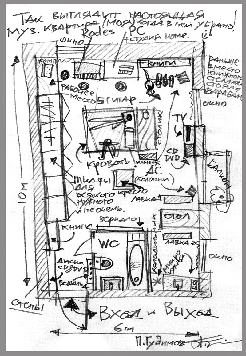 Нас заинтересовала надпись в левом верхнем углу схемы: «Раньше вместо книжного стеллажа стояли барабаны». Выяснилось, что в квартире, где и без того прописались 5 гитар, Rodes и целая домашняя студия, ранее обитала настоящая барабанная установка. Около полутора лет Гудимов с группой репетировал дома, не обращая никакого внимания на огорченных звездным сожительством соседей. А огорчаться был повод — в частной беседе Пашины знакомые уверяют, что барабанный бой был слышен уже на подъезде к дому. Что уж говорить о людях, живущих по соседству! Тем не менее жильцы дома мужественно терпели до нынешнего Нового года, после чего попросили Гудимова сделать им супер¬подарок — избавиться от барабанов. Паша не отказал.