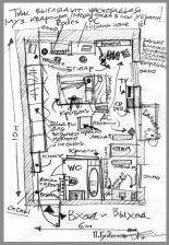 Нарисовав для МАN схему квартиры рок-музыканта, фронтмен группы имени себя, галерист и дизайнер Паша Гудимов убедительно просил не вытирать жестоким ластиком его личные комментарии к рисунку. Мы оставили все как есть, по ходу изучения плана задавая дополнительные вопросы.